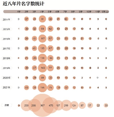 据记者不完全统计,从2014年至2022年3月,中国电影市场共上映了2783部国产电影(其中不包括重映、无票房数据产出的电影),电影片名长度从1字到18字都有涉及。资深院线经理李玉霖告诉新京报记者,国家电影局对于电影片名的长度没有要求,通常需要电影制作方在立项的时候进行申请,在很多年前,甚至还有20字以上的片名,只是这种案例这几年逐渐减少。记者对近三千部电影进行了筛查统计,发现这些电影里2字至9字片名数量相对较多,达2596部,占据了整个电影数量的93%。其中,最常用也最受青睐的当数4字片名影片,达967部,占比34%,例如《流浪地球》、《红海行动》等;其次“受宠”的是5字片名,共475部,占比17%,例如《我不是药神》、《西虹市首富》等;最少使用的是1字片名影片,仅有9部,比较出名的要数张艺谋执导的《影》。