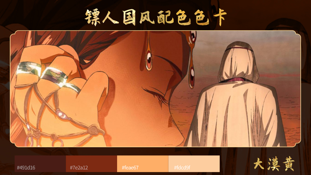 从画面来看,制作团队为动画特意设计的残阳红、大漠黄、刀锋墨、墨染朱等六套专属色卡,被广大动画迷们所喜爱,一如网友评价提及的那样“中式复古的红、幽静深沉的蓝还有体现了大漠风情的配色,在审美这点上,《镖人》真的绝了”。大胆启用的高饱和度色调更是凸显了团队在画面构建及色彩应用上力求品质与极致的双重加持。