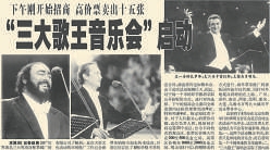 世界著名三大男高音歌唱家帕瓦罗蒂、多明戈、卡雷拉斯首次同台献艺,是在1990年世界杯的演出上,此后许多国家都想邀请三大歌王重现辉煌,但是同为球迷的三人早已达成默契:只在每4年一次的世界杯上演出。2001年6月23日晚,北京邀来歌迷热盼已久的“世界三大歌王”在紫禁城午门广场联袂放歌。三位音乐家在中央歌剧院交响乐队和合唱队的伴奏下,演唱了《星光灿烂》《今夜无人入睡》《月亮河》等脍炙人口的歌剧选段或歌曲,数万热情观众对精彩的演出报以阵阵热烈的掌声。这场盛大的演出成为世界音乐舞台和中国对外文化交流的盛事。(2001年6月24日《北京日报》1版,《世界三大男高音放歌午门》)