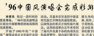 与此同时,“中国风”演唱会登陆香港地区和东南亚国家,把中国八九十年代富有民族艺术特色的通俗歌曲以演唱会的形式加以展示,受到了众多华夏儿女的热情关注和高度赞许。(1996年10月7日《北京日报》5版,《’96中国风演唱会完成彩排》)