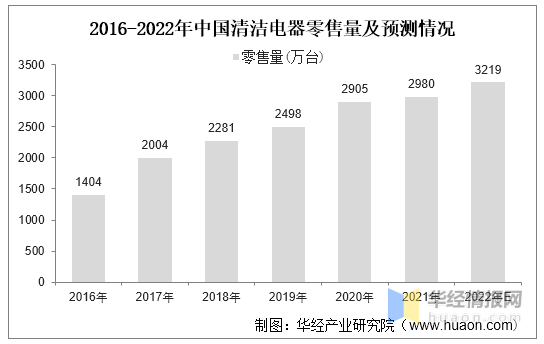 根据华经产业研究院数据显示,2016年至2021年,我国清洁电器市场规模由约101亿元提升至309亿元,期间年复合增长率为25.06%;零售量从1404万台,增长至2980万台,预计2022年零售量将超过3000万台。中国清洁电器市场方兴未艾,前景广阔。