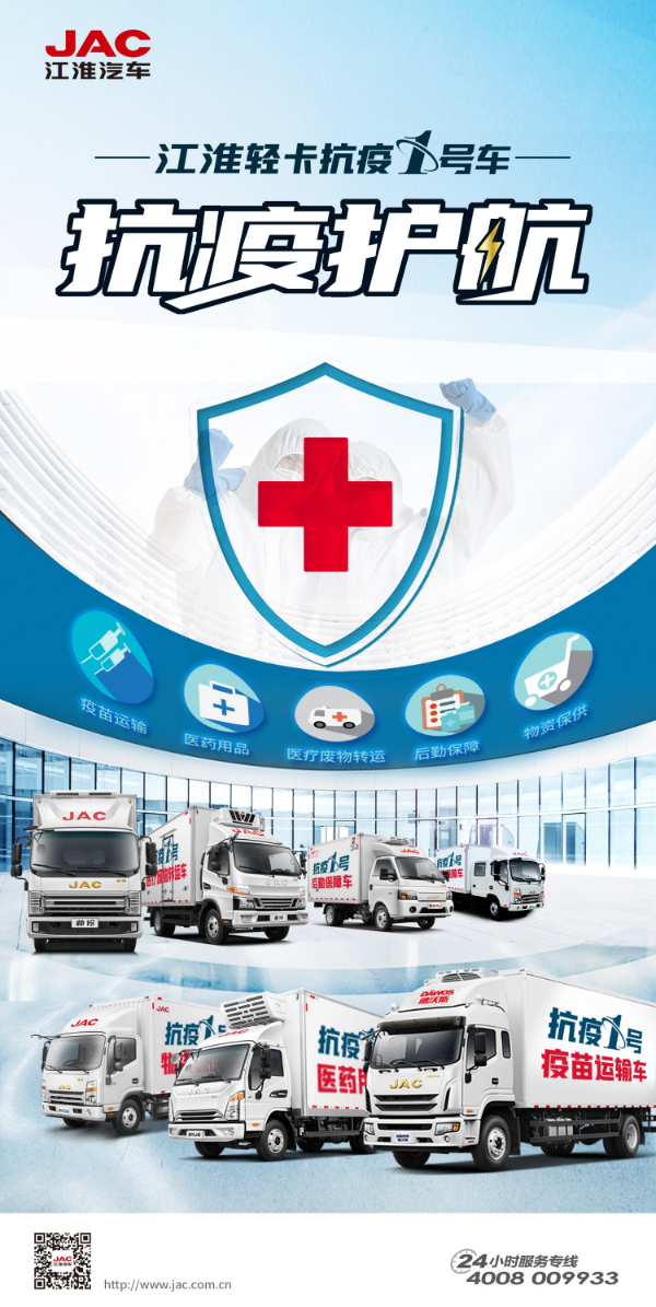 江淮轻卡依托强大的研发能力和技术储备,立足抗疫所需,开发全场景、全工况、多用途、专业化的防疫车辆,打造出轻卡行业最全面的“抗疫1号车”产品矩阵,驰援各地抗疫,为抗疫保驾护航。