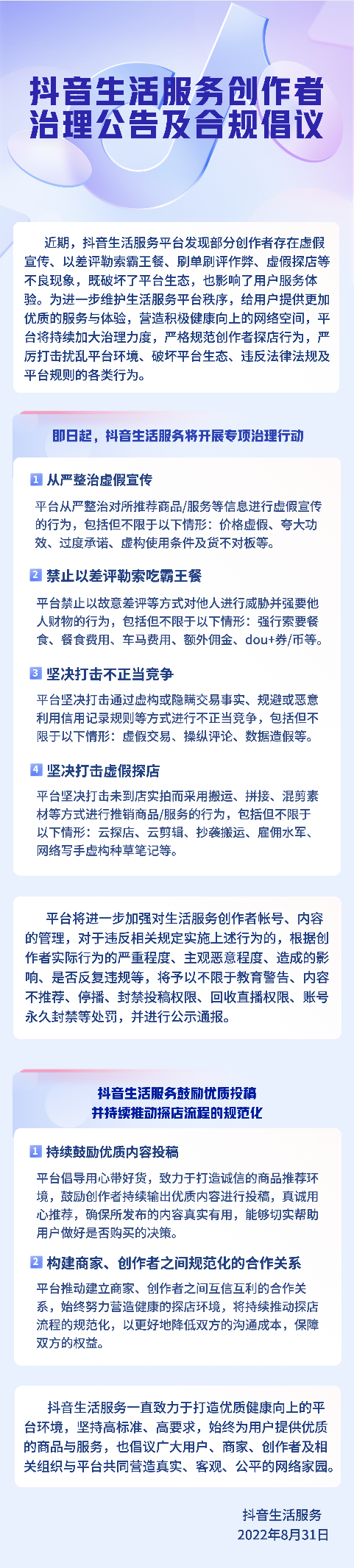 近期,抖音生活服务平台发现部分创作者存在虚假宣传、以差评勒索霸王餐、刷单刷评作弊、虚假探店等不良现象,既破坏了平台生态,也影响了用户服务体验。为进一步维护生活服务平台秩序,给用户提供更加优质的服务与体验,营造积极健康向上的网络空间,平台将持续加大治理力度,严格规范创作者探店行为,严厉打击扰乱平台环境、破坏平台生态、违反法律法规及平台规则的各类行为。