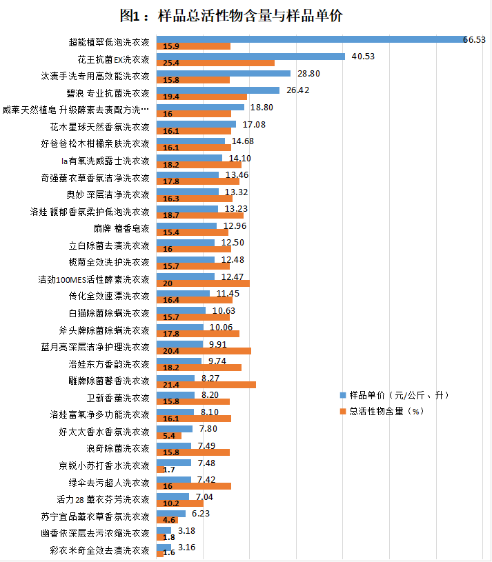 中国消费者协会消费指导部副主任赵宇表示,洗涤剂中总活性物含量直接关系着洗衣液的去污能力,也可反映出洗涤剂的成本情况及质量水平。一般来讲,总活性物含量越高的洗涤剂,去污效果越好,价格相对较高。测试结果显示,样品中总活性物含量最高的为25.4%,最低的只有1.6%。31款样品中有25款总活性物含量高于15%(此数值为洗衣液行业推荐标准值)。有3款洗衣液样品的总活性物含量低于2%,分别为“京锐小苏打香水洗衣液”、“幽香依深层去污洗衣液”、“彩衣米奇全效去渍洗衣液”,结合其去污力测试结果,属低价低质产品。标称“彩衣米奇全效去渍洗衣液”、“京锐小苏打香水洗衣液”、“幽香依深层去污洗衣液”等3款单价非常便宜的样品,经测试总活性物含量最低,各项去污能力明显较差。因此,消费者购买洗衣液时不能一味贪图便宜。