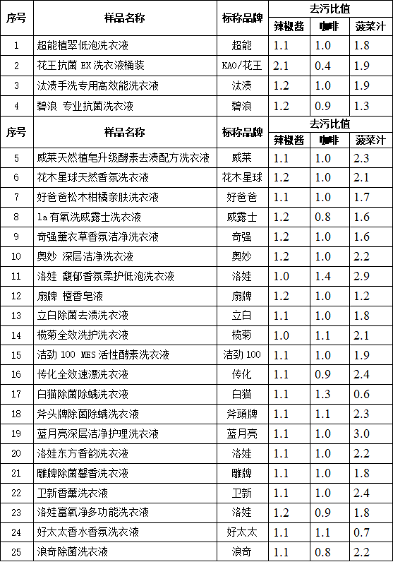 经测试,有24款对标准污布的去污能力强于标准洗衣液,其中标称“洛娃馥郁香氛柔护低泡洗衣液”、“超能植翠低泡洗衣液”、“浪奇除菌洗衣液”、“威莱天然植皂升级酵素去渍配方洗衣液”、“好爸爸松木柑橘亲肤洗衣液”、“蓝月亮深层洁净护理洗衣液”、“花木星球天然香氛洗衣液”、“立白除菌去渍洗衣液”、“奥妙深层洁净洗衣液”等9款样品去污效果更为出色,尤其对蛋白污渍的去污能力表现突出。