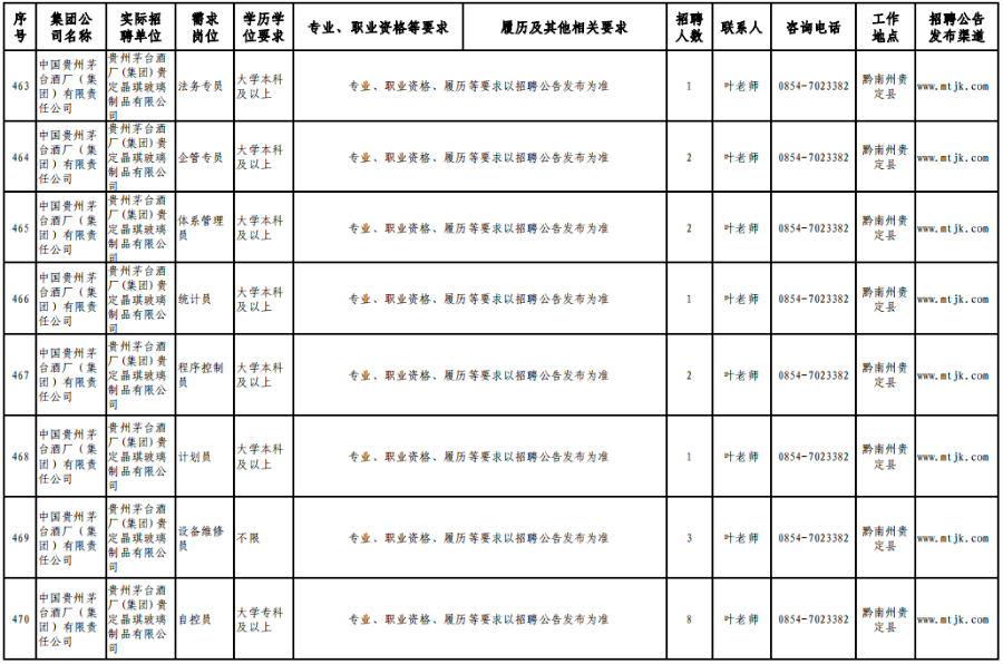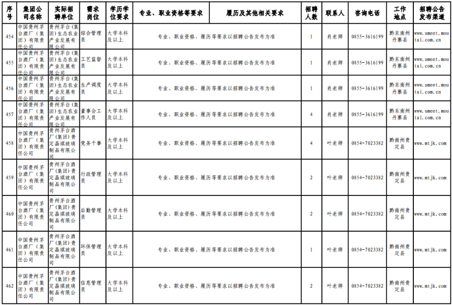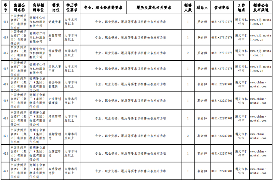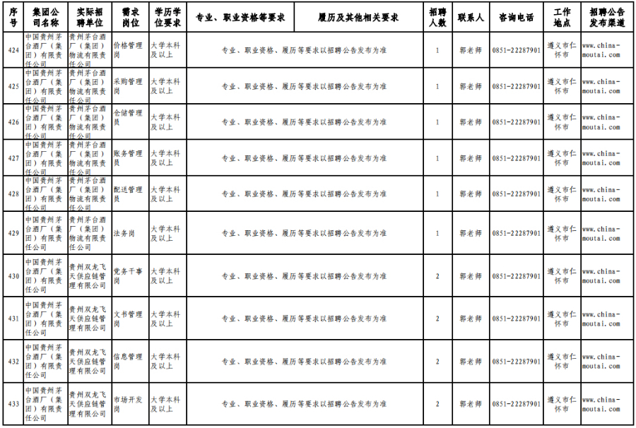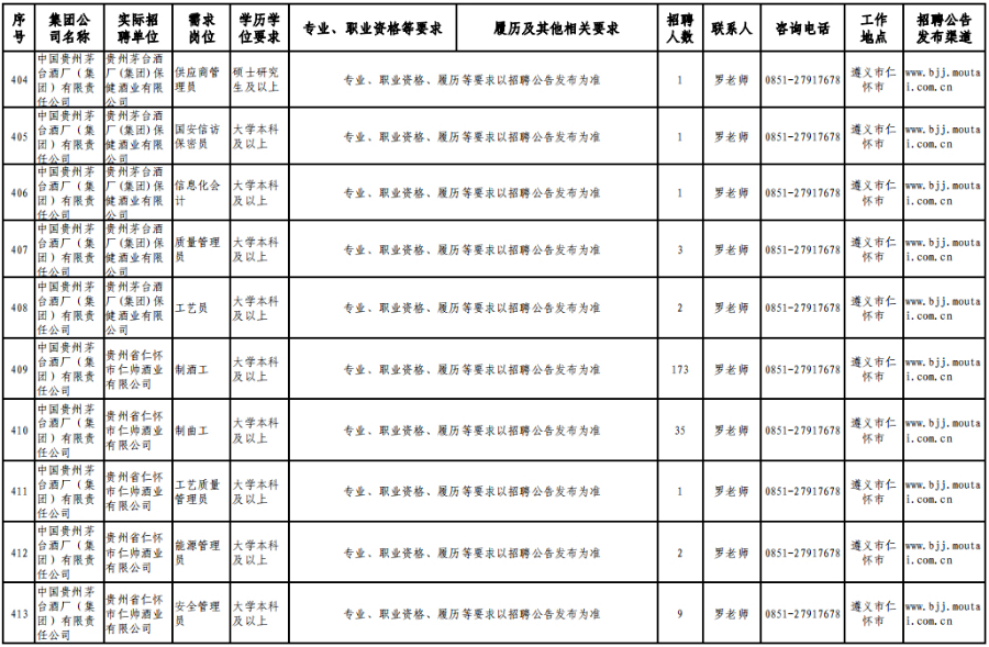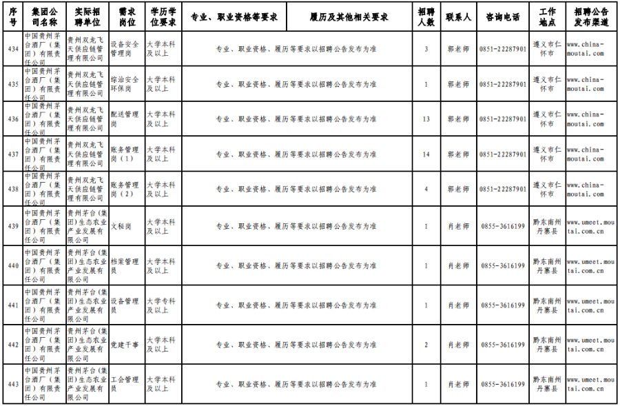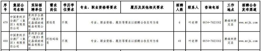 3月15日,在贵州理工学院(贵安校区)体育运动场举办的专场招聘会上,茅台集团计划招聘1120人。旗下贵州茅台酒股份有限公司招聘制曲工109人,贵州茅台酒股份有限公司和义兴分公司招聘制酒工200人、制曲工240人,其余在本场招聘会开展招聘的还有贵州茅台酒厂(集团)保健酒业有限公司、贵州省仁怀市仁帅酒业有限公司、贵州茅台酒厂(集团)物流有限责任公司、贵州茅台(集团)生态农业产业发展有限公司等,岗位包含宣传文化干事、采购管理员、工艺质量管理员、信息化会计等。