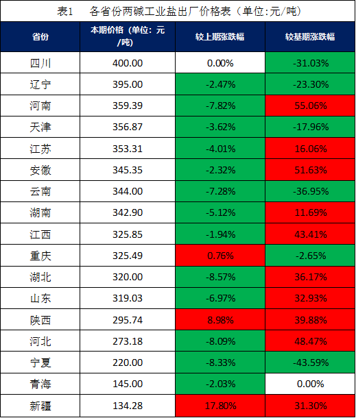 分价格区间来看,本期两碱工业盐单价在400-500元/吨之间的地区有1个,是四川;两碱工业盐单价在400元/吨以下的地区有16个,分别是辽宁、河南、天津、江苏、安徽、云南、湖南、江西、重庆、湖北、山东、陕西、河北、宁夏、青海、新疆。