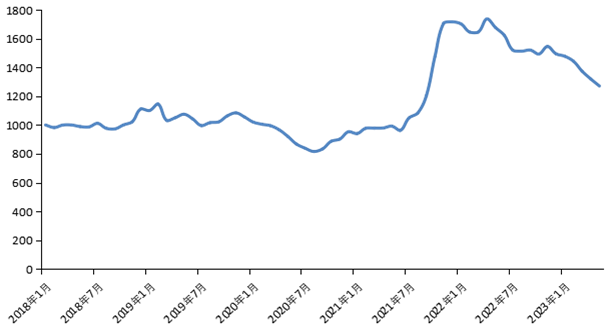 5月份,新华·中盐两碱工业盐价格指数报1271.00点,较上期(2023年4月)下跌48.72点,跌幅3.69%;较基期(2018年1月)上涨271.00点,涨幅27.10%。