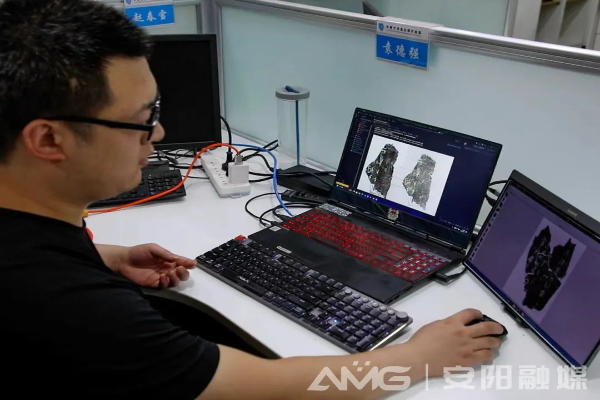 该实验室三维研究室负责人郭安操作电脑向记者展示,显示器上,在数字空间里高保真还原的甲骨实物可以360°旋转,也能放大或缩小。通过微痕分析,记者不仅能看清甲骨片上的文字刻写风格和笔画叠压关系,还能了解钻凿形态、卜兆裂纹、材质纹理等信息。