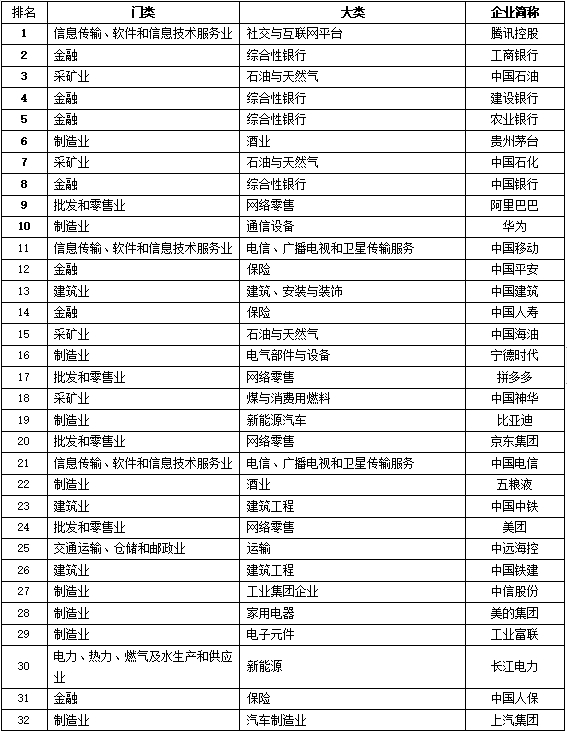 工业(含建筑业)排名前十名:中国石油、贵州茅台、中国石化、华为、中国海油、宁德时代、中国神华、比亚迪、五粮液、中信股份;