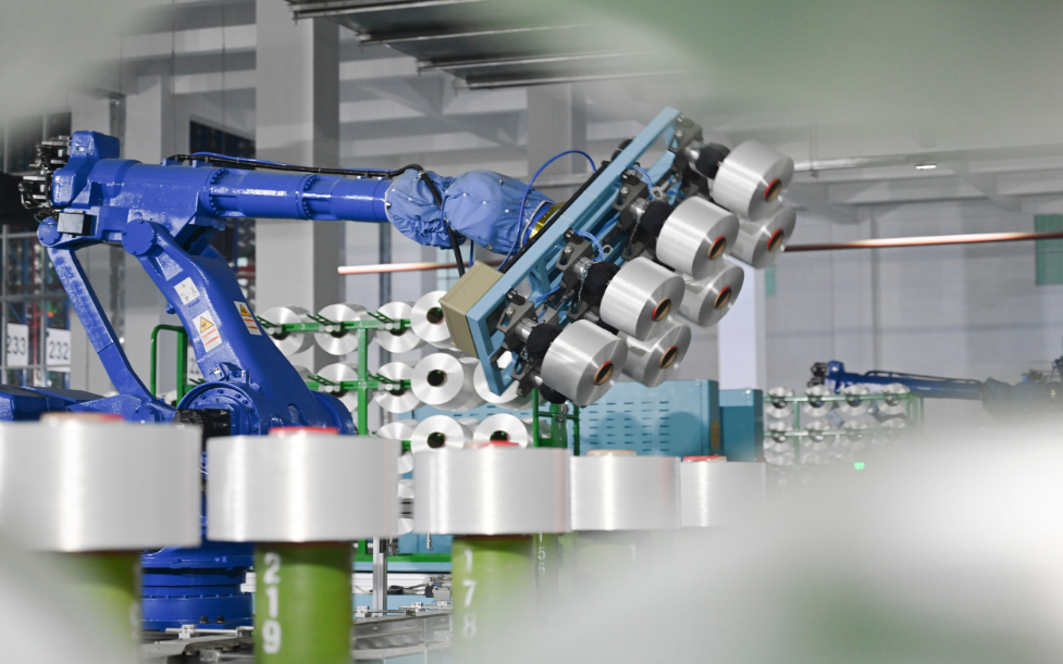 7月29日,在福建省泉州晋江的百宏聚纤公司5G智能化工厂,机械臂在涤纶工业丝流水线上作业。新华社记者 宋为伟 摄