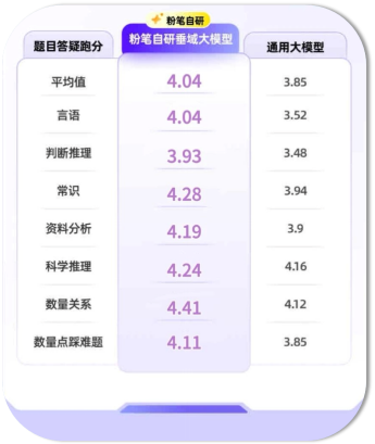 根据内部测算,粉笔垂域大模型平均评分比通用模型高出约0.2分,尤其在言语、判断推理和常识等等科目上表现更为突出。