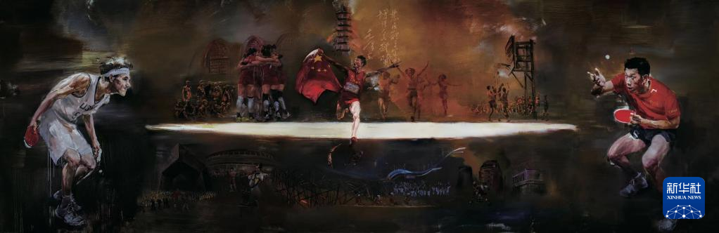 双年展期间,走进中国美术馆,人们无不被扑面而来的运动之美所感染。画家王学贤、燕娅娅、王学儒创作的油画《体育强国 梦想激荡》上,一束“强光”横穿画面,代表中国运动史上的生命之光。