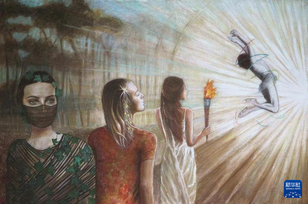 印度尼西亚画家鲁瑟里笔下,全副武装的防疫人员怀抱着地球陷入深思,传达着对疫情的担忧;黎巴嫩画家的《期盼》中,金发少女在阳台上摘下口罩眺望远方,憧憬未来;柬埔寨画家的《如果没有新冠病毒》中,人们纵情舞蹈……