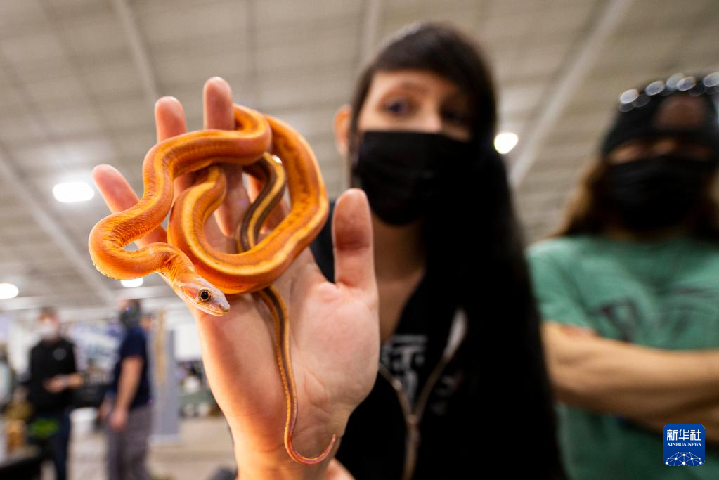 2月27日,在加拿大米西索加举办的爬行动物展上,一名参展商展示一条玉米锦蛇。 新华社发(邹峥 摄)