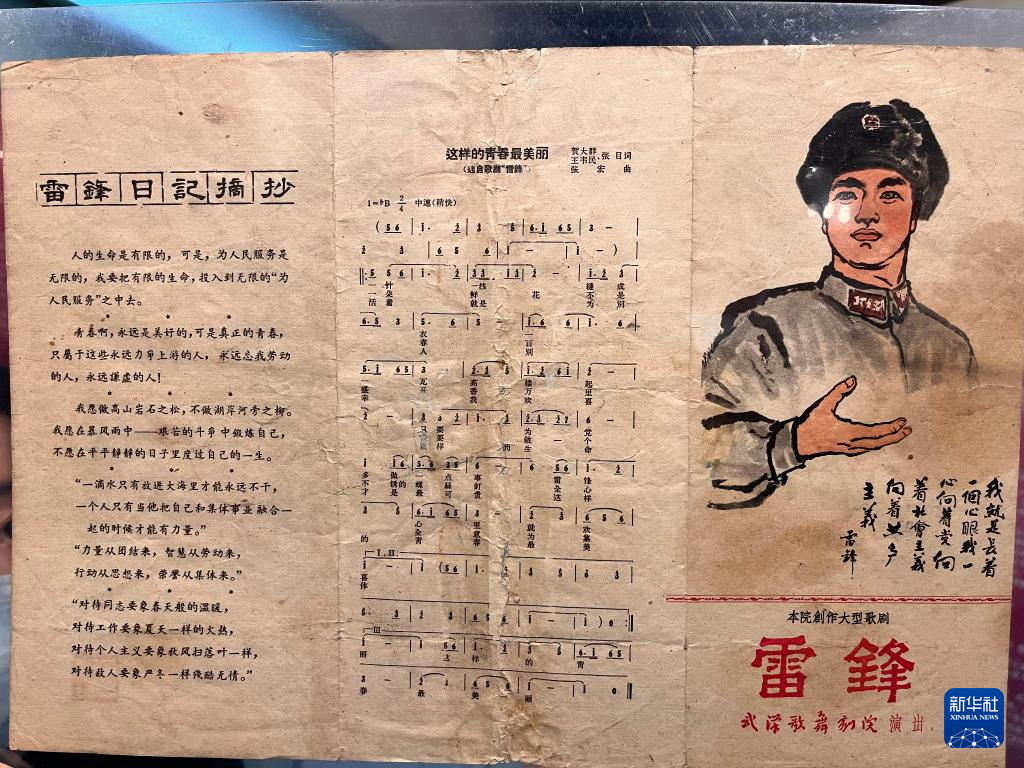 展览中还有一张1963年的歌剧节目单,印有歌剧《雷锋》选段、“雷锋日记摘抄”,以及一张由国画大家汤文选绘画设计的雷锋头像。据了解,当年武汉歌舞剧院第一时间根据雷锋生前的事迹编剧创作出8场歌剧《雷锋》,将雷锋形象搬上舞台。