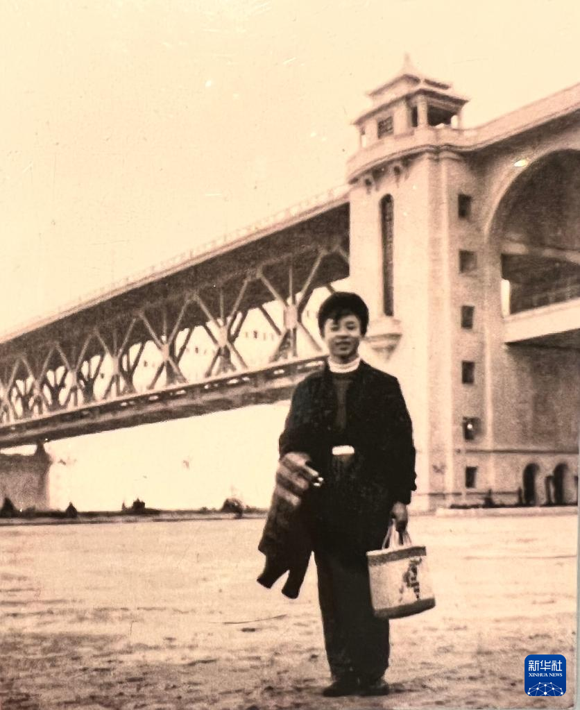 雷锋与武汉长江大桥合影(翻拍)。图片由受访者提供。