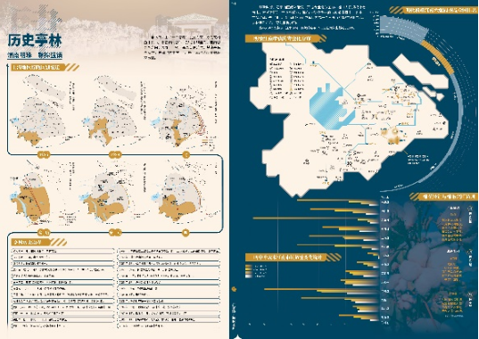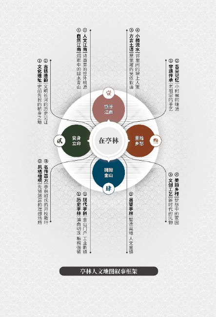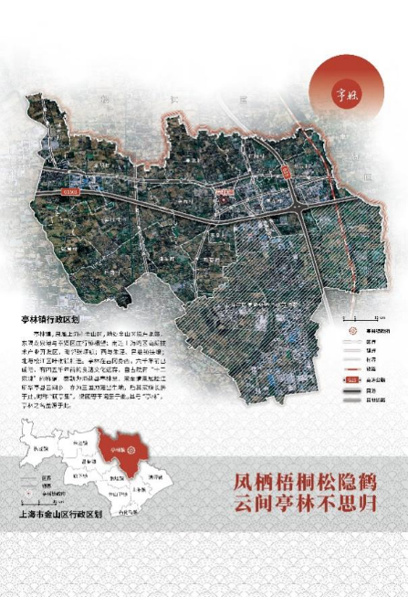 《亭林人文地图》以“凤栖梧桐松隐鹤·云间亭林不思归”为隐喻主旨,构建“感受江南”“安身立命”“重拾乡愁”“拥抱金山”等4个图组的叙事线索,以15个图幅30个页面的专题时空信息图示,系统性地解说亭林“自然优渥(禀赋)—人文昌盛(历史)—乡愁浓郁(传承)—城镇繁荣(发展)”的内在逻辑。
