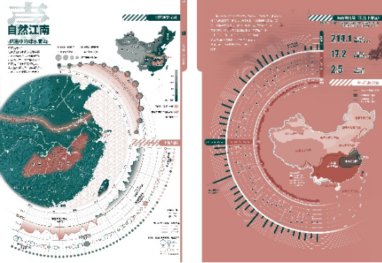 图组1“在亭林 · 感受江南”,内容上通过自然江南、人文江南、方言土语、小桥流水等4个图幅,“自下而上”地呈现亭林江南文化的自然基础、历史底蕴和典型景观;设色上整体嵌入“日出江花红胜火,春来江水绿如蓝”的“绿映红”,在宏微相接的尺度空间变换中铺垫出亭林所处的自然与人文底色。该图组中,知识供给得以强化,如在“自然江南:烟雨中的绿水青山”图幅设计中,即充分兼容地貌、气候区划地图与多元气候数据统计图表,尤其将江南自然印象中的典型梅雨特征量进行特写,数据指标多样,知识层次丰富。