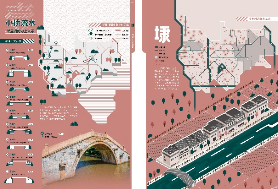 为此,编制团队通力协作,基于多地多维调研,尝试从宽、窄、中多层次视角进行叙事意象梳理、区域禀赋分析、目标需求识别和主题分解演绎,并在内容大纲、形式表达及其叙事衔接的融合设计上着力谋求创新,强化图件多向度观察的文化表现张力和空间叙事力。就大纲编排而言,图集拓展了镇域人文地图集的架构方式——鲜明的叙事主题、自恰的图组逻辑、分层的写意写实(图组写意而图幅写实)——为专题地图集的主旨凝练、观点解说提供了范式指引;就形式表达而言,图集丰富了镇域人文地图集的可视化手法——叙事结构的视觉响应、多元空间的综合整合与虚实要素的符号协同——亦为专题地图集的信息设计提供了实践参考。而活页式的封套装帧方式,也给予不同阅读主体根据兴趣选择切入点的自由,更可为内容的更新和续编提供灵活的延伸接口。