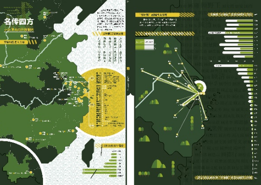 图组2“在亭林 · 安身立命”,内容上通过文化遗址、古镇遗韵、凤栖梧桐、名传四方等4个图幅,“由古及今”地呈现亭林适宜人居的遗存见证、代表人物和后世影响;设色上整体借“春风又绿江南岸,明月何时照我还”的黄绿配色方案,充分彰显了文脉绵延的生命力意象。该图组中,资料数据得以挖掘,如“名传四方:亭林顾氏的开枝散叶”图幅通过族谱文献资料与互联网大数据相结合的挖掘整理,在全国、长三角两个尺度将先人历史的全景版图与今人当下的网络关注格局关联起来,翔实重现了吴郡顾氏三族之一的亭林顾氏——从东汉颍川太守顾奉、东吴丞相顾雍到南朝地理学家、文字训诂学家、史学家顾野王并及后世名人——生生不息的家族空间图谱。