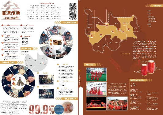 图组3“在亭林 · 重拾乡愁”,内容上通过非遗传承、舌尖记忆、文创工艺、美丽乡村等4个图幅,“以小见大”地呈现亭林生活积淀的精湛技艺、传统美食和乡韵乡愁;设色上取“落红不是无情物, 化作春泥更护花”的红泥暖调,更添一份古典温厚、守正开新的传承意象。该图组中,图与非图实现“翻转”,如“非遗传承:老祖宗的手艺”等图幅设计中,给予地图以配角角色,或作为非遗手艺传承保护基地的坐标索引,或作为“一村一品”等区域特色比较的定位参照;同时,通过边界消解、形态和尺寸的灵活调节,合理达成与多元非地图图解的融合构图方式。