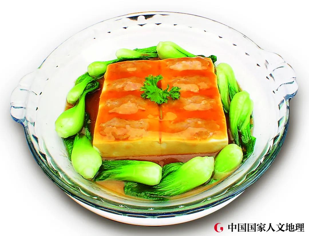 “一品豆腐”是孔府的一道传统菜,因明清时期孔子嫡系后裔贵为一品大员,故得此名。它选用孔府“豆腐户”所制的13厘米见方的整块豆腐,将豆腐片去上皮作盖,中间挖洞填入10多种配料烹制而成,口味鲜香,营养丰富。此菜以蒸法烹调,可保持豆腐的原始风味,最能发挥清肺热、胃气,男女老少皆宜食用。