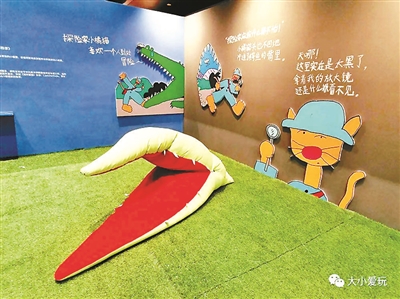 中央活动区没有宣传中的充气花朵,而是经典的大黄鸭,地面布置成了花园石板路,模拟小时候的跳房子游戏,每块“鹅卵石”上都有一道题目,答案藏在各个展厅里,答对题可获得贴纸。