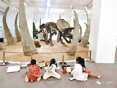 展览一层像走进了自然博物馆,巨大的恐龙骨架,按照1:1复原,足有8米长,仔细看还有只小小的盗龙骨架,没有小朋友能抵得了恐龙的魅力。