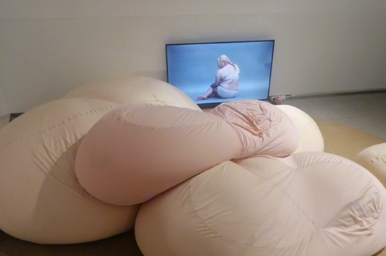 徐若昕穿着黑色的运动内衣和短裤,袒露着四肢和腰腹,蜷缩在中央美术学院美术馆一间展厅的角落里。她把自己埋在布艺沙发的褶皱之间,那是五团布垫,肉粉色,像堆积的云朵,也像她的肚子。