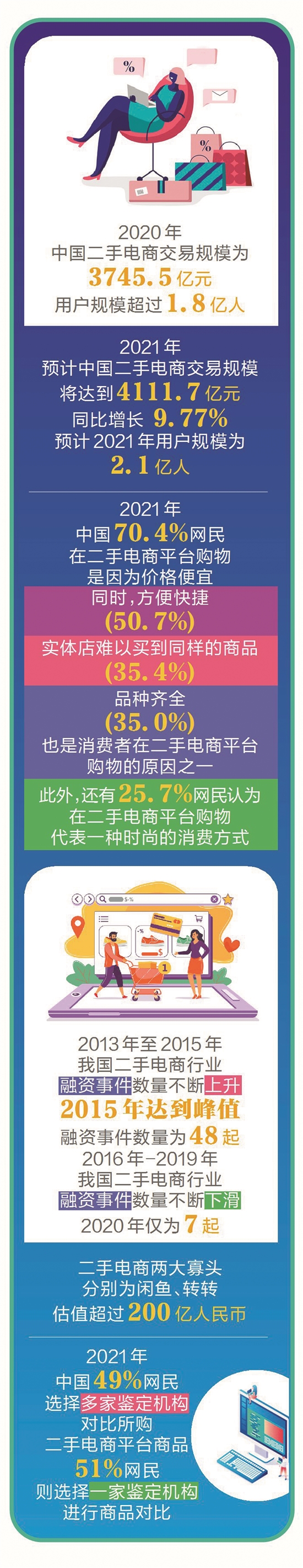 网经社电子商务研究中心的预测显示:2021年,二手电商市场规模将达4111.7亿元,同比增长9.77%;用户规模将达2.1亿人,同比增长15.38%。