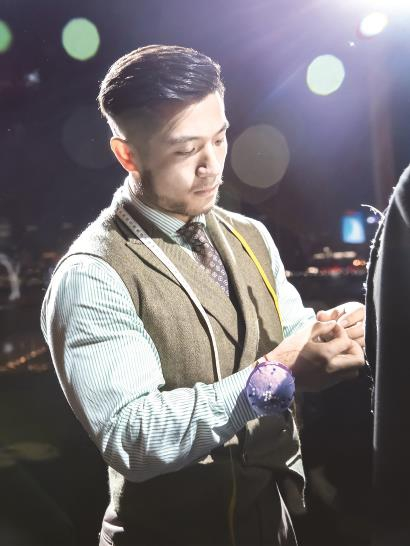 作为店铺主理人,他的主要任务是把控制版逻辑和风格输出。正式老派死板严肃“爸爸的衣服”或者“中介穿的”是国人对西装认识的一个大标签,这种固有的思维和眼光时常让他有点沮丧,但也让他更有一种去传达的使命感,因为西装真的不是这个样子。他以英式高定西装为基础,加上自己审美和比例的同时,保持英式的基本规范,更贴合亚洲人的身形,继而满足每一个客户本身的独特追求和喜好。“很多人看过我的设计以后,基本上给到的评价都是挺拔和力量感,甚至大家觉得我这种故意强调肩腰比例会给人距离感甚至攻击性。”首先设计风格和他追求阳刚之气有关,他觉得男人视觉表达的身形状态应该是追求倒三角的V形(V shape),当然定制肯定不能强迫客人接受他的风格,所以Rainier&Co.也推出了不同系列,让大家有一个缓和递进的过程:他设计的男装,强调肩胸的雄伟和收腰的比例,只会在艺术家系列里给希望尝试的客人体验;起步的城市系列提供最基础的商务套装需求;精英系列和礼服系列则会有更多面辅料和工艺组合的选择。他会把设计理念做一些减法:削弱胸腰比和强硬肩膀带来的距离感,内敛的驳头造型也会让所谓的攻击性被中和掉。但关祖宜始终恪守职业之道:“还是那句话,Bespoke是服务,是根据客人的要求来创造他需要的外观和给人的印象。无论是强硬个性或者平凡日常,挺括或者柔软贴体,我们的服务标准还是以客为尊的。”
