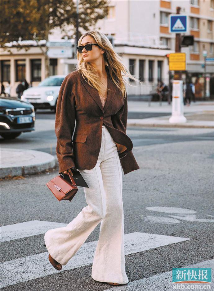 ▶春夏季节一直包裹到脚的超长喇叭裤可能会显“闷热”,这时候选浅色,将会比深色更适合。
