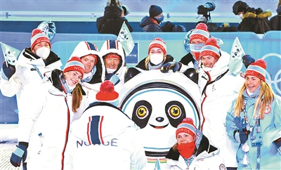 2月14日,挪威代表团成员在张家口赛区颁奖广场与“冰墩墩”合影