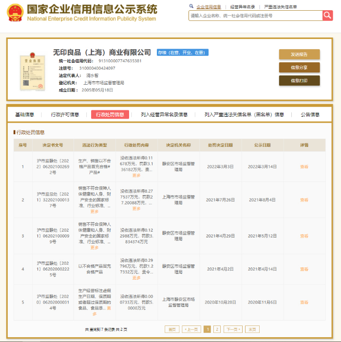 国家企业信用信息公示系统显示,自2020年以来,无印良品(上海)商业有限公司共有七条行政处罚信息,涉事商品包括运动鞋、背带裙、榉木衣架、低型餐桌、浴巾、膨化食品等:今年3月,该公司因生产、销售以不合格产品冒充合格产品被罚超3万元;去年7月26日、4月29日,因销售不符合保障人体健康和人身、财产安全的国家标准、行业标准、地方标准(仅限条例)产品,分别被罚款约27万元和3.8万元;去年4月2日,因以不合格产品冒充合格产品被罚约1.3万元;2020年10月28日,因生产经营标注虚假生产日期、保质期或者超过保质期的食品、食品添加剂被罚款5万元……