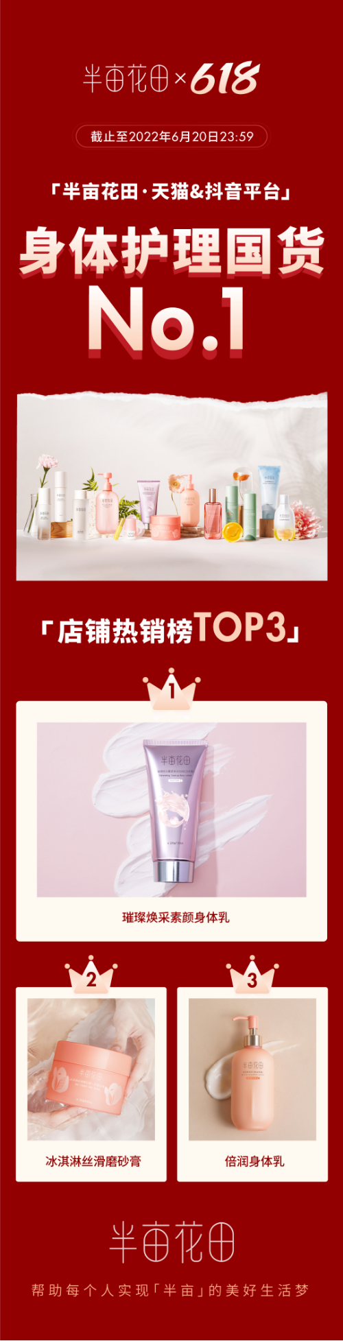 在严峻的市场环境下,行业和资本趋于冷静,品牌面临更大的成长压力。电商平台也在积极寻找新的增长点,比如618周期拉长,助力释放消费潜力。截止6月20日23点59分,身体护理品牌半亩花田,抖音同比增长396%,,抖音平台+天猫平台身体护理国货排名双双第一!