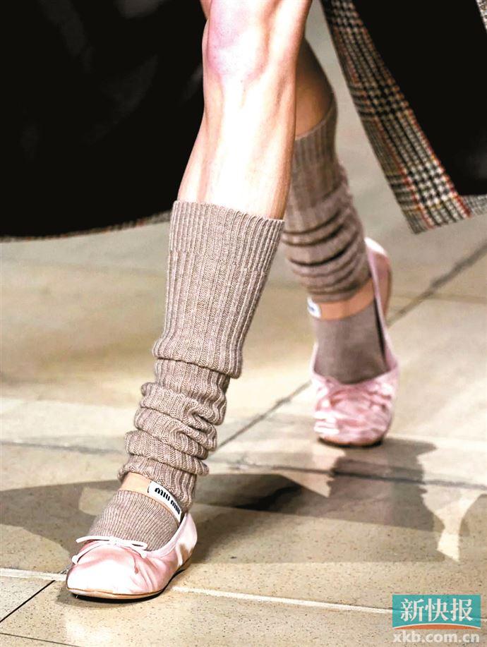 Miu Miu2022秋冬秀场将芭蕾舞鞋与学院风的职装及低腰、迷你版型的裙裤结合,打造出多套极具千禧风和都市学院氛围的芭蕾美学穿搭,在时尚圈掀起热潮。2023春夏巴黎时装周期间,芭蕾舞鞋与学院风的造型席卷了巴黎街头。袜套也是芭蕾美学造型搭配中最常用的搭配单品之一,芭蕾袜套最初是为防舞者受伤而设计的具有保护脚踝、防滑等实用功能性的单品,如今袜套也受上世纪九十年代复古潮与千禧风流行的影响,从功能性演变出更多新潮时髦的可能。