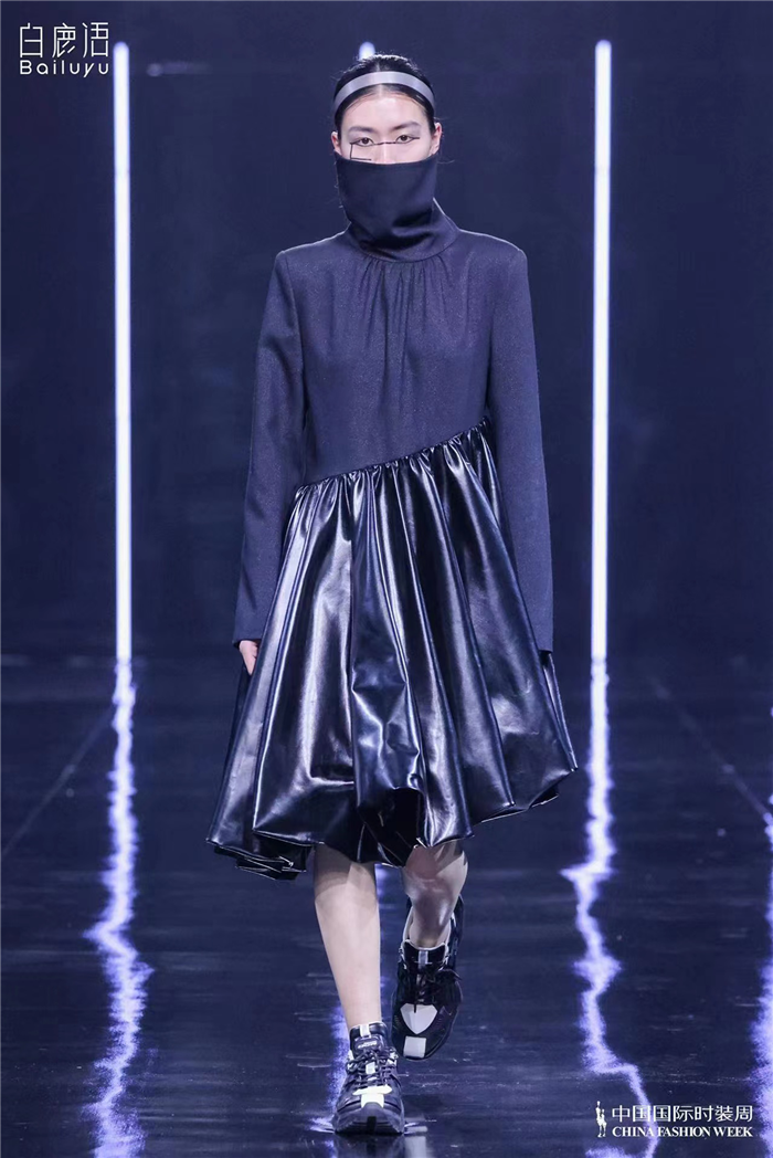 赵晓妹的设计呈现出一种冷峻的美学语言。无论是肩部与裙摆处的不对称设计,还是充满流动感的水滴袖,都试图深入探索和解读“无序”与“秩序”之间的关系。