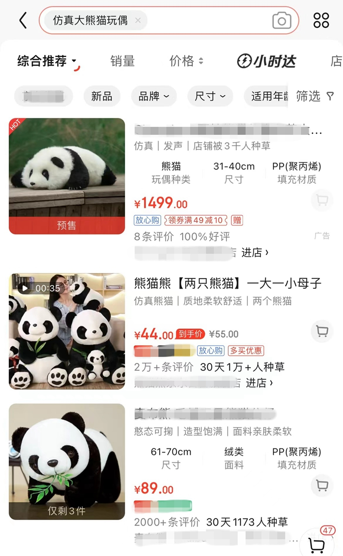 记者在多个电商平台观察,目前仿真大熊猫玩偶价格参差不齐,从几十元到几千元的都有。相较于传统的熊猫造型毛绒玩具价格只有几十元,仿真大熊猫玩偶价格动辄上千,且销量一直不错。