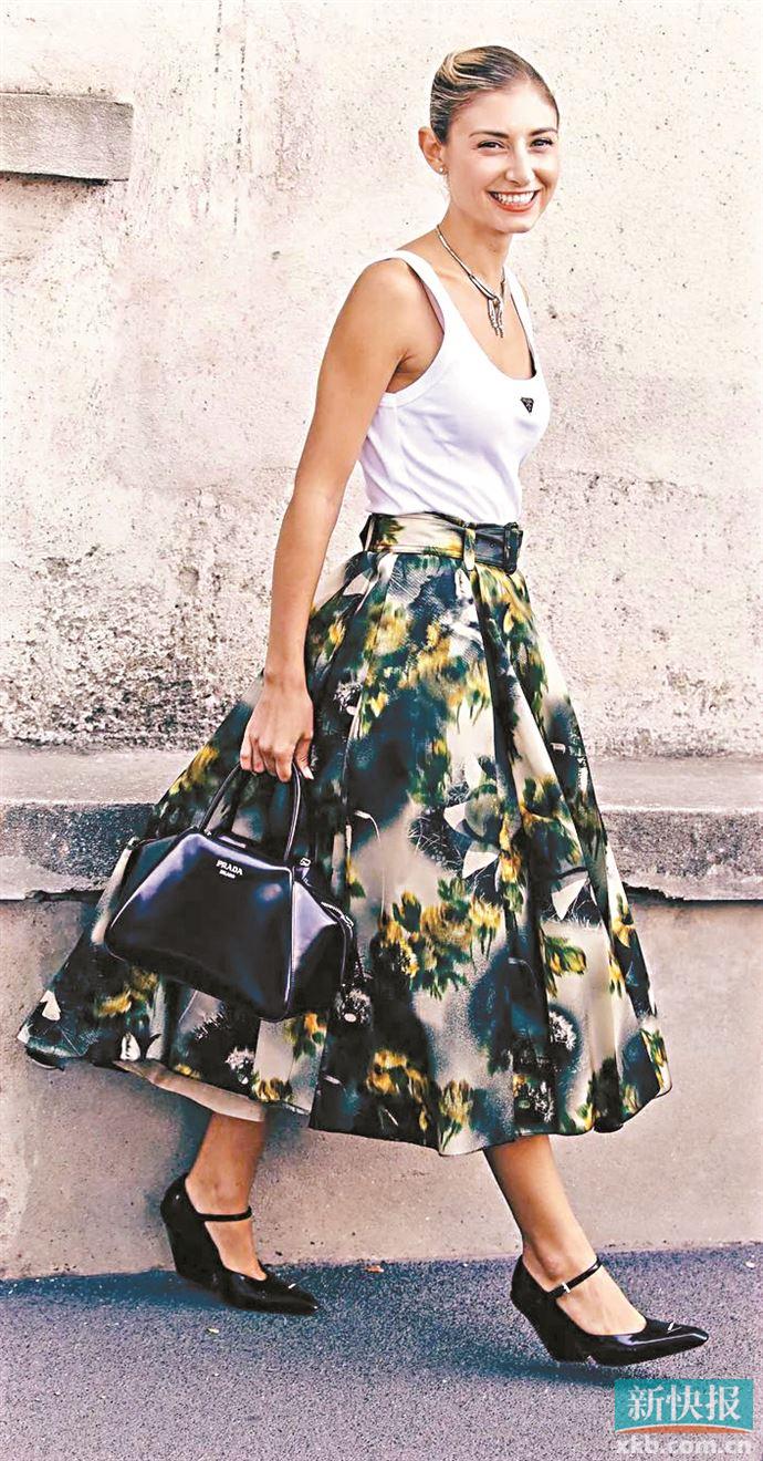 选择度假造型用的伞裙时,裙摆的长度很重要,比较适合的是膝下10到15厘米的长度,既经典又容易藏肉,即便是通勤也没有问题。