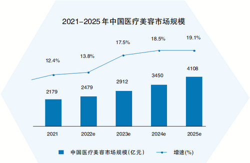 根据艾瑞咨询《2022年中国医疗美容行业研究报告》,2021 年中国医疗美容市场规模达到2179亿元,增长率12.4%,预计2025年中国医美市场规模将达到4108亿元,2021年至2025年年均复合增长率17.2%,有望在较大市场规模下维持较高增长速度。