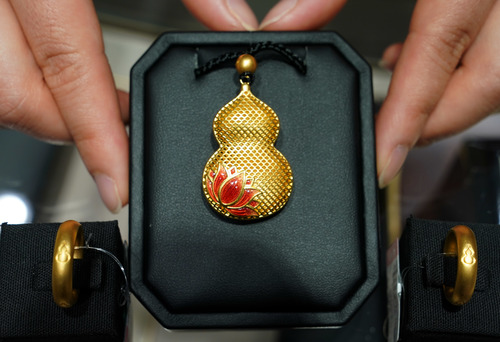 工作人员正展示一款金饰。(2020年5月摄)新华社记者 刘颖 摄