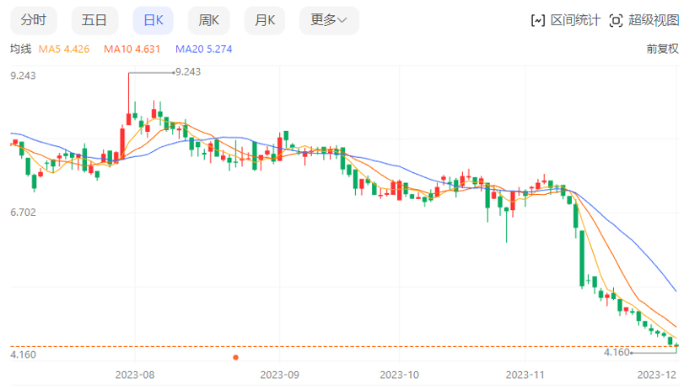 自11月7日开始,特步国际的股价持续下跌,截至12月5日记者发稿,股价已跌至4.27港元/股,创下2021年4月以来的新低。