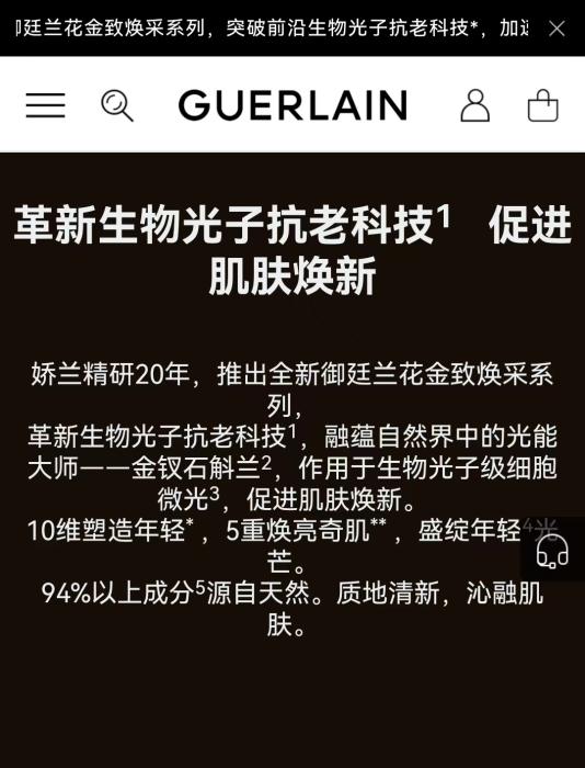 记者注意到,虽然在娇兰的法国官网上,仍旧留有关于“量子生物学”的宣传,但在娇兰中国官网及某电商平台官方旗舰店宣传页面上,已将其形容为“生物光子抗老科技”。