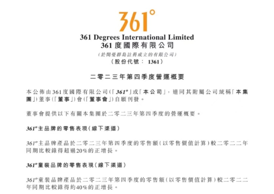 在运动品牌中,不仅安踏看重童装市场,361°也在不断发力,最新营收表现亮眼。1月16日,361°发布2023年第四季度营运概要,在线下渠道方面,361°主品牌零售额较2022年同比增长超20%,361°童装品牌零售额较2022年同比增长约40%。童装业务已成为361°营收的重要支撑。