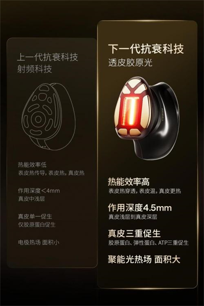 热能效率高:与传统射频美容仪相比,透皮胶原光技术形成的是面状超大热场,作用面积更广,抗衰效率更高。