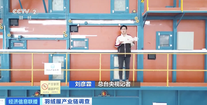 总台央视记者 刘彦霖:在江苏淮安一家羽绒制品企业的生产车间内,鹅毛如何完成分类发往不同的羽绒制品销售公司呢?全靠一台“五厢分毛机”的大机器。它的高度有22.5米高,相当于民用住宅的9层楼。它的内部通过风机的不断工作,根据绒毛的不同重量,分为一、二、三、四、五厢不同级别的绒毛,最后打包完成后发往不同的羽绒制品公司进行销售。