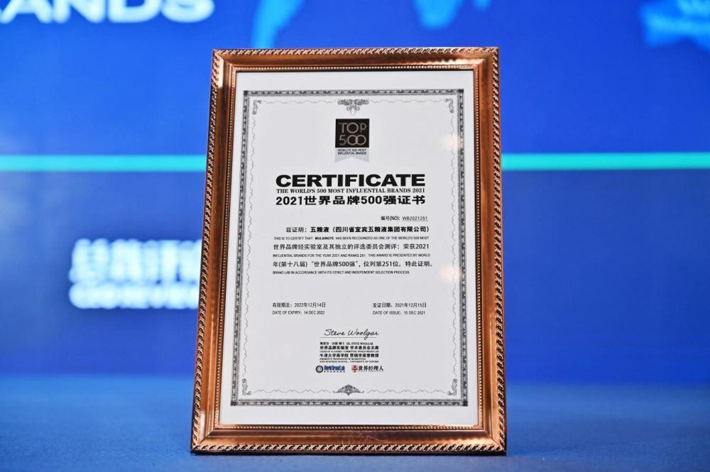 12月15日,由世界品牌实验室主办的2021年世界经理人峰会暨(第十八届)世界500强发布会在北京举行。会上发布2021年度《世界品牌500强》榜单,五粮液连续5年入选榜单,品牌排名上升至251位,提升21位,在世界级品牌行列中持续向更高位次攀升,并获得2021年(第十五届)“五星钻石奖”称号。
