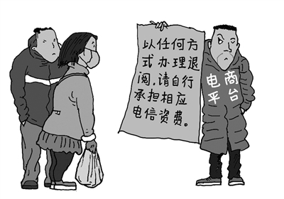 0.1元的商业短信退订费该由谁出,事小理不小。面对消费者“追鸡杀牛”的维权困境,需要有关部门站出来为消费者撑腰。一方面,有关部门应约谈电商平台,要求其删除霸王条款,并允许用户通过APP免费退订商业短信。另一方面,鉴于“短信退订费自行承担”侵犯了不特定多数消费者利益,各级消协组织可以提起公益诉讼,要求电商平台停止侵权行为,并承担赔偿责任,从而倒逼其敬畏消费者权益,摒弃“店大欺客”念头。 张淳艺 漫画/陈彬