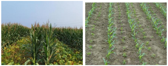图1 大豆玉米带状间作模式 图2 大豆玉米等行距1:1间作模式、